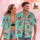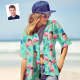 Chemise Hawaïenne Avec Visage Personnalisé, Chemise Tropicale Flamant Rose, Tenue De Couple, Imprimé Sur Tout Le Vert Et Les Feuilles De Palmier