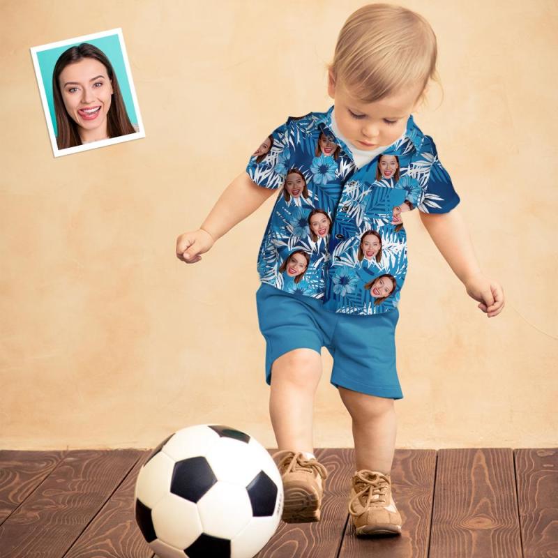 Chemise Hawaïenne Visage Personnalisé Des Gamins Impression Intégrale Chemise À Manches Courtes Bleue
