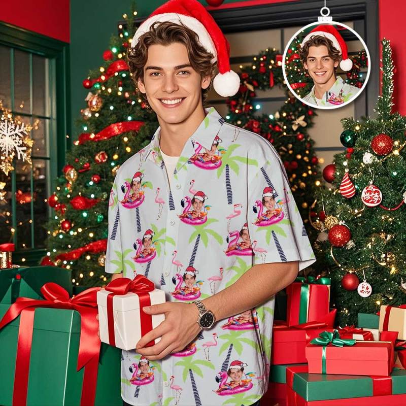 Chemise Hawaïenne Visage Personnalisé Personnalisé Flamant Feuilles Arbre Noël Chemise Hawaïenne Visage Chemise Hawaïenne Cadeau