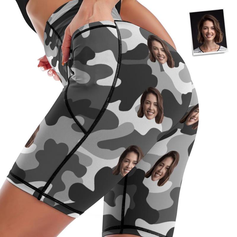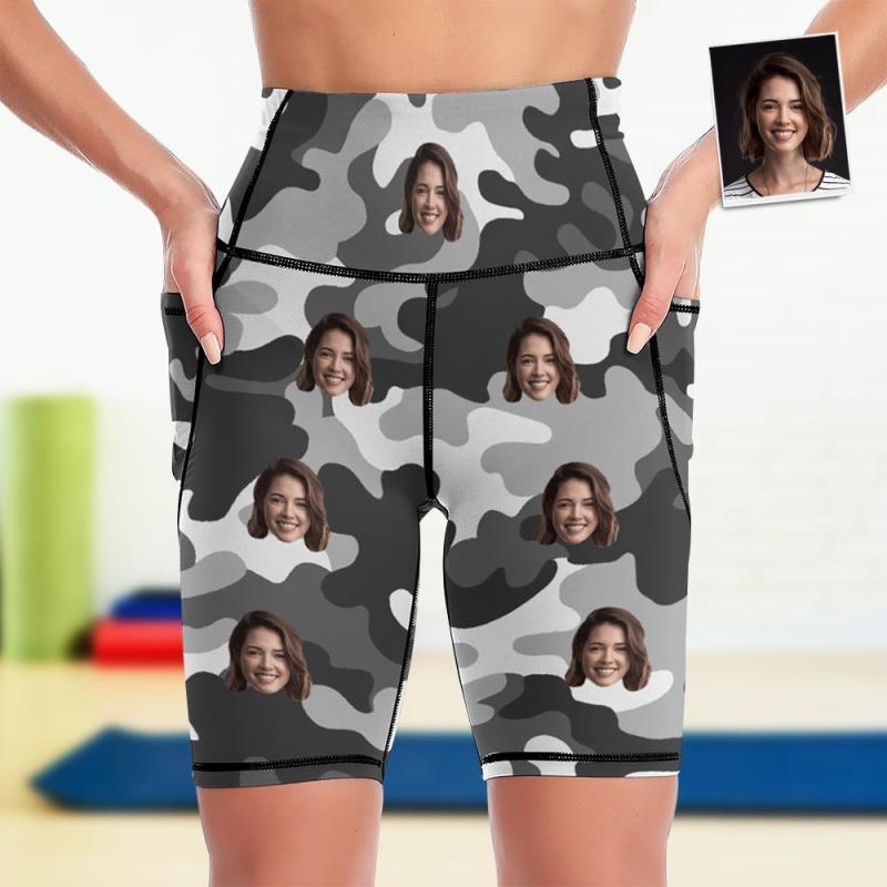 Visage Personnalisé Genou Longueur Collants Shorts De Yoga Pour Femmes Running Leggings Avec Poches - Camouflage Gris