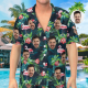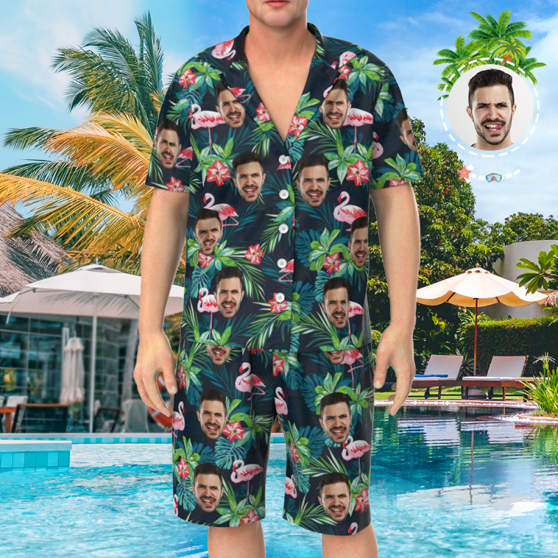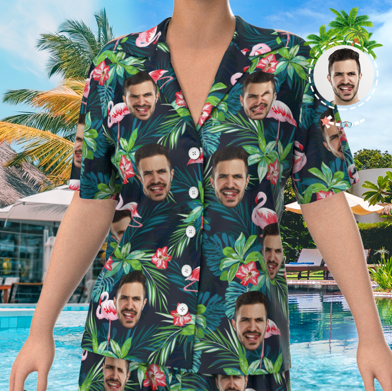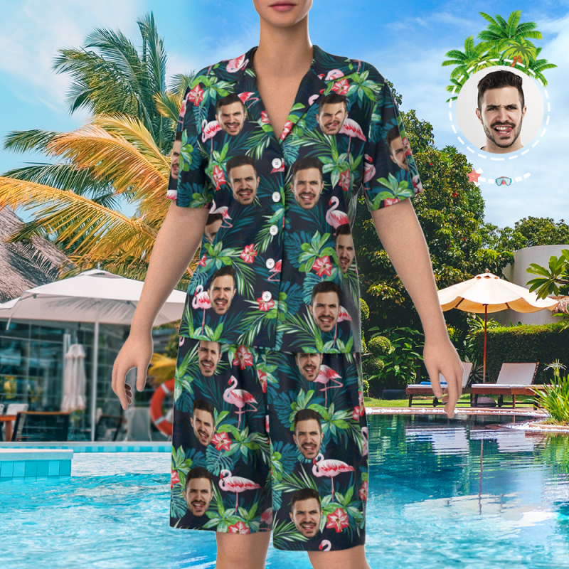 Visage Personnalisé Sur Ensemble De Pyjamas, Vêtements De Nuit À Manches Courtes, Vêtements De Nuit Boutonnés - Feuilles Et Flamants Roses
