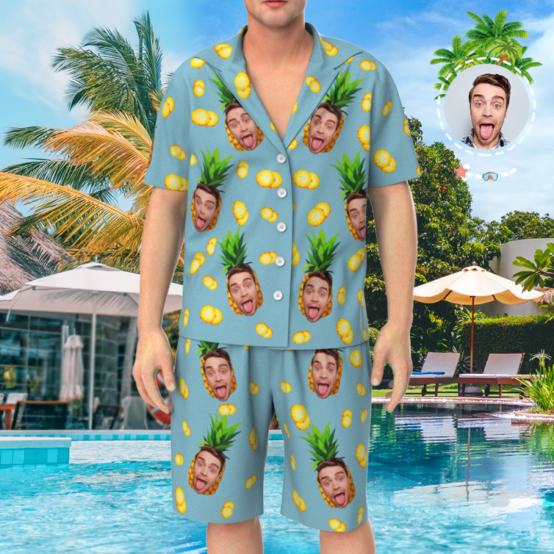 Visage Personnalisé Sur Ensemble De Pyjamas, Vêtements De Nuit À Manches Courtes, Vêtements De Nuit Boutonnés - Ananas