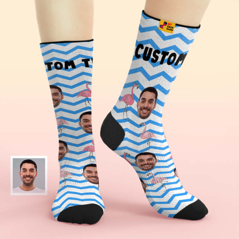 Chaussettes Personnalisées Pour Le Visage Ajoutez Des Images Et Nommez Des Flamants Roses Chaussettes Douces Respirantes En Zigzag Bleu