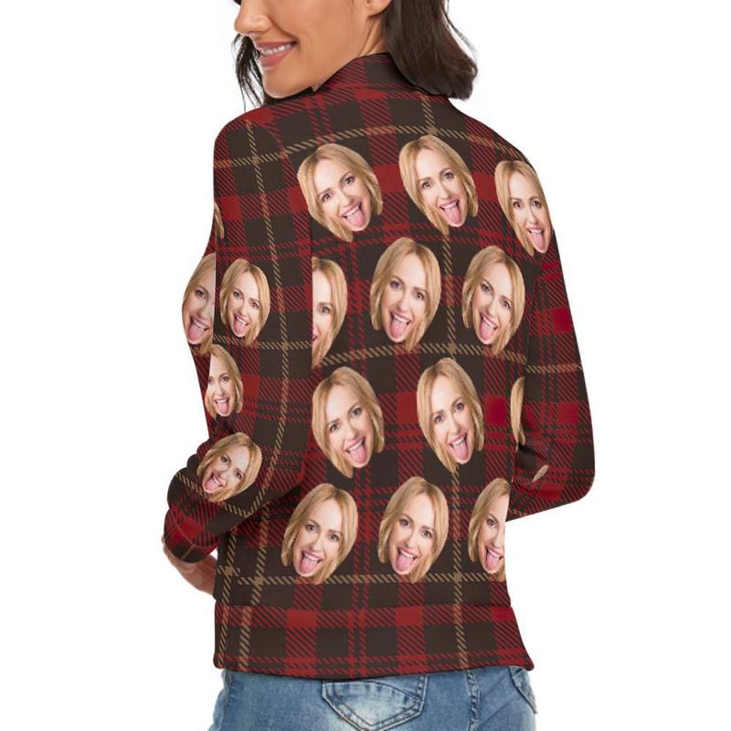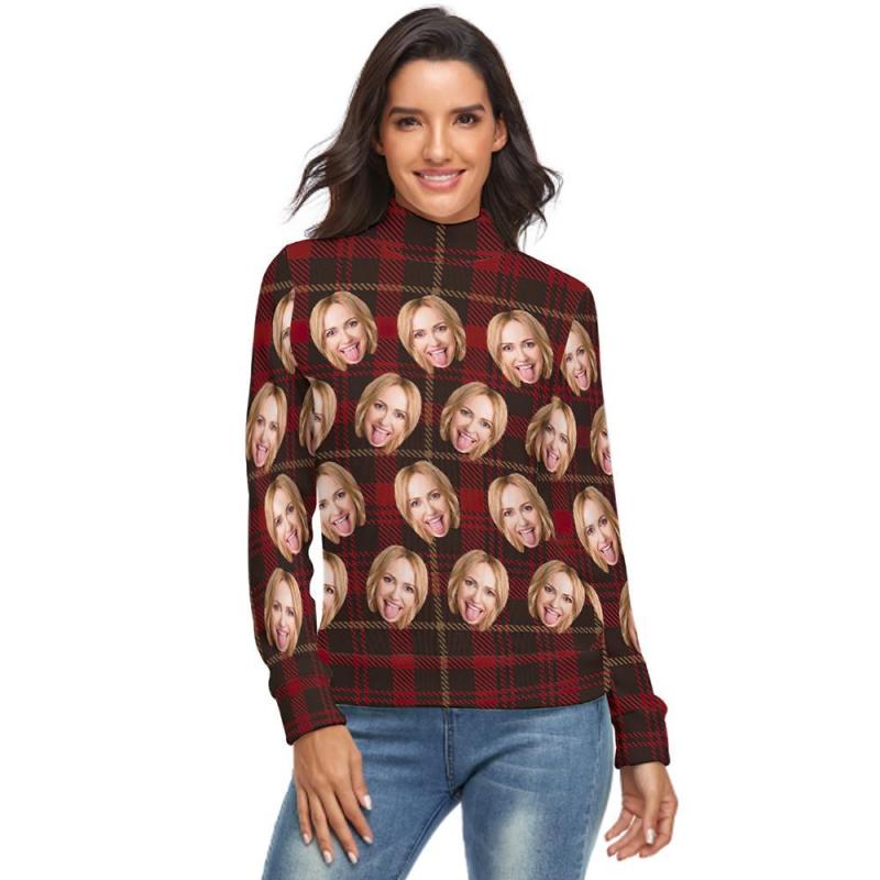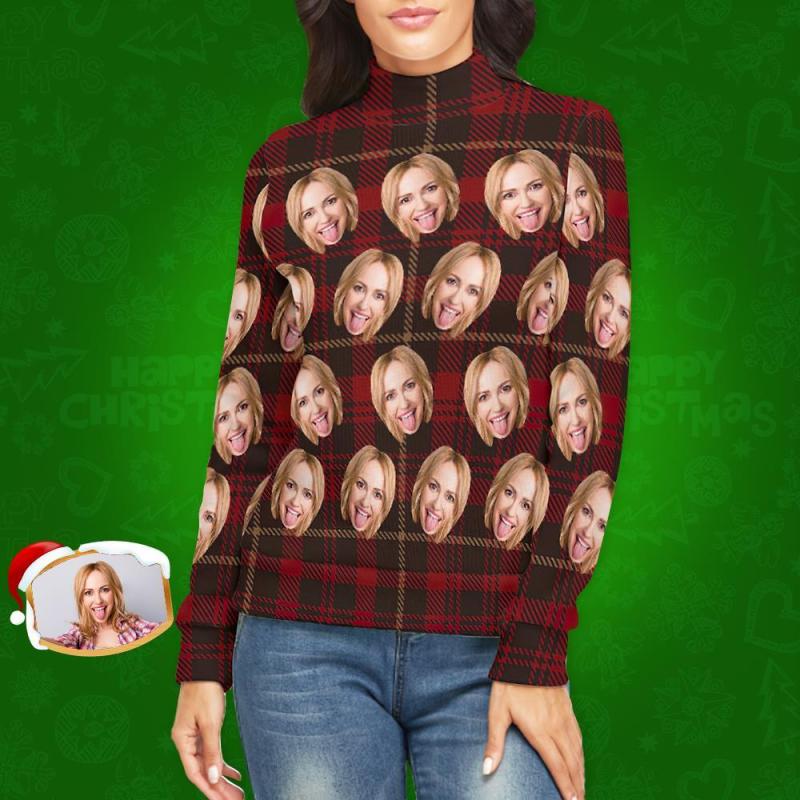 Col Roulé Visage Personnalisé Pour Femmes Chandail De Noël Moche Tricoté Pulls Lâches - Plaid Rouge Classique