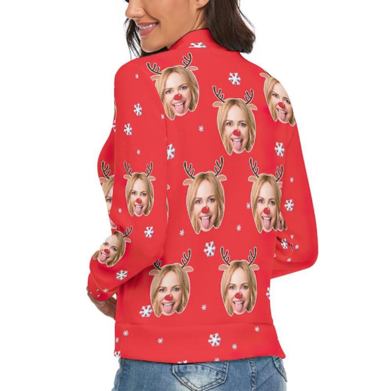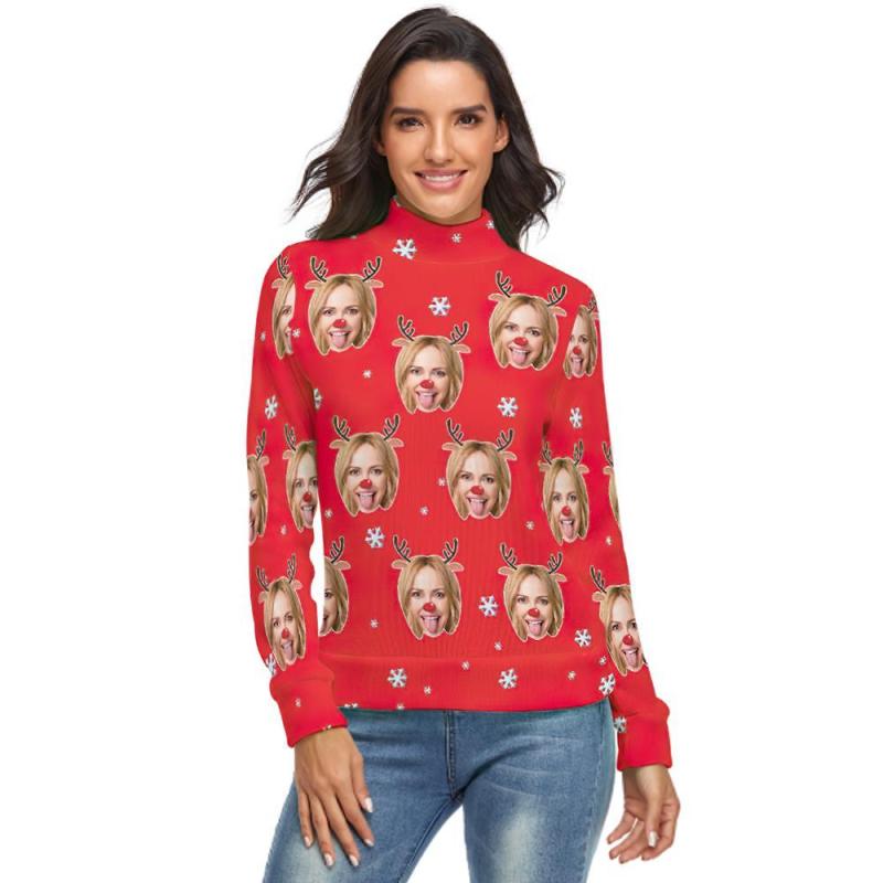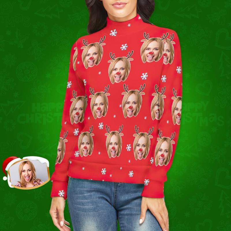 Col Roulé Visage Personnalisé Pour Les Femmes Chandail De Noël Moche Pulls Lâches Tricotés - Renne
