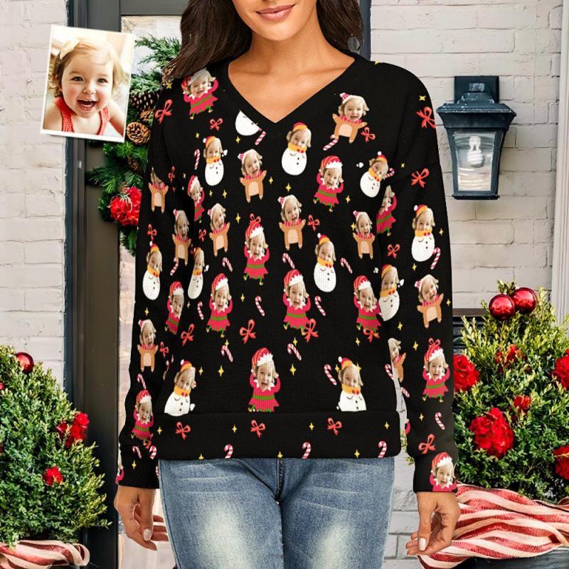 Visage Personnalisé Femmes V-cou Chandail De Noël Animé Et Charmant Spandex Confortable