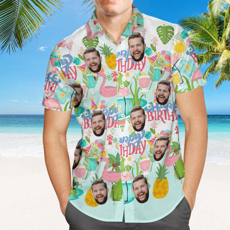 Chemise Hawaïenne De Joyeux Anniversaire Personnalisée Flamingo Party Chemise De Visage Personnalisée - VisageChaussettes Chemise Hawaïenne De Joyeux Anniversaire Personnalisée Flamingo Party Chemise De Visage Personnalisée - VisageChaussettes