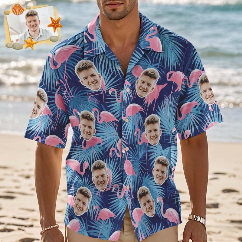 Chemise Hawaïenne Personnalisée Avec Photo De Flamant Rose Et Fleur Bleue, Chemise Hawaïenne Amusante Pour Les Fêtes Et Les Vacances