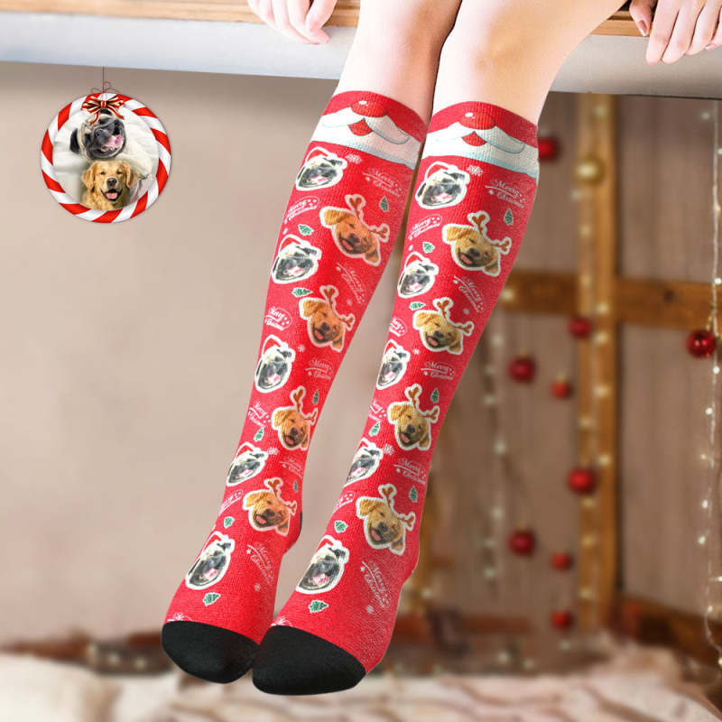 Chaussettes Hautes Personnalisées Chaussettes Visage Personnalisées Visage De Chien Joyeux Noël Pour Amoureux Des Animaux De Compagnie