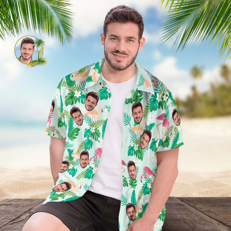 Chemise Hawaïenne Personnalisée Avec Visage Imprimé Sur Tout Le Visage, Feuilles Vertes Et Flamant Rose
