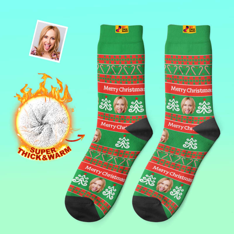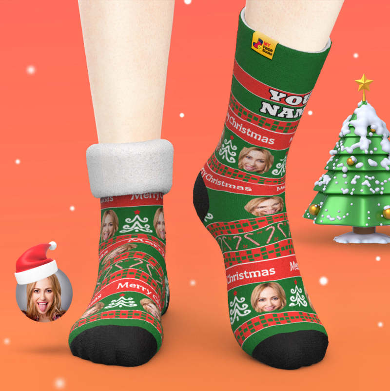 Chaussettes Épaisses Personnalisées Photo 3d Chaussettes Imprimées Numériques Automne Hiver Chaussettes Chaudes Vert Santa Chaussettes Cadeau De Noël