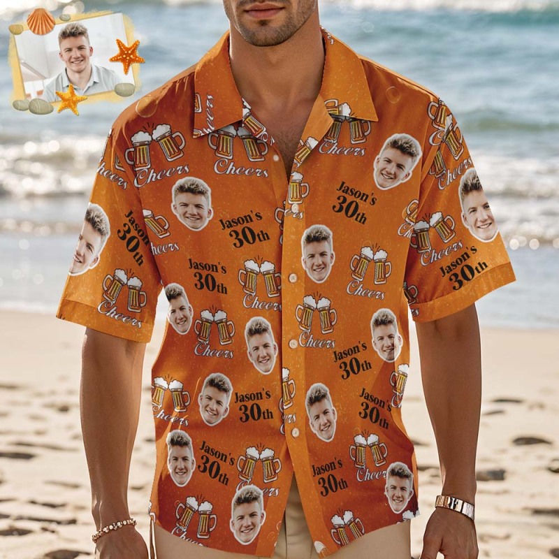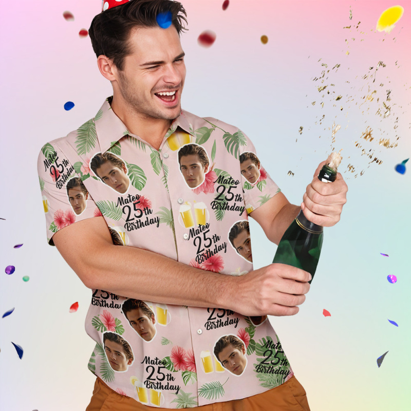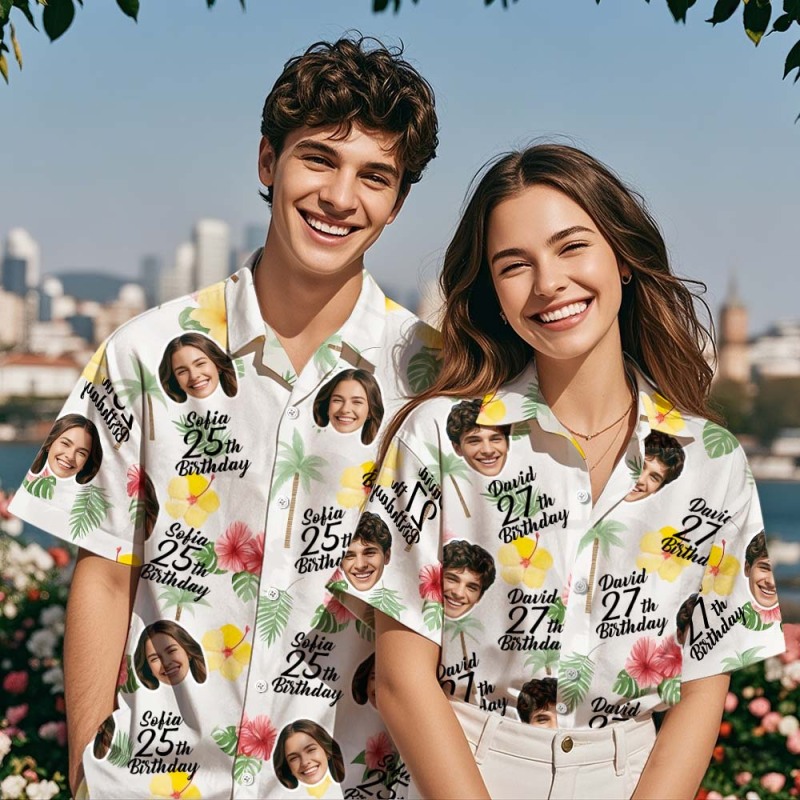 Chemise Hawaïenne Personnalisée Pour Couple D'anniversaire, Nom De Visage Personnalisé, Fête D'anniversaire D'été, Chemise Rose Aloha, Chemise Hawaïenne D'anniversaire, Cadeau D'anniversaire