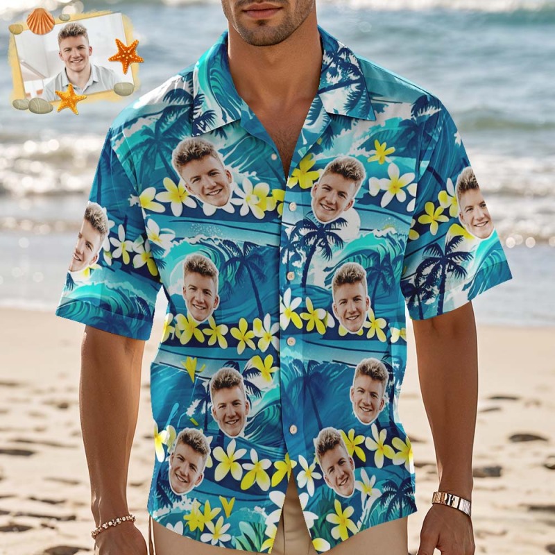 Chemise Hawaïenne Personnalisée Avec Visage De Fleurs Vertes, Chemise Photo Personnalisée Pour Homme, Cadeau Amusant Pour Les Vacances D'été